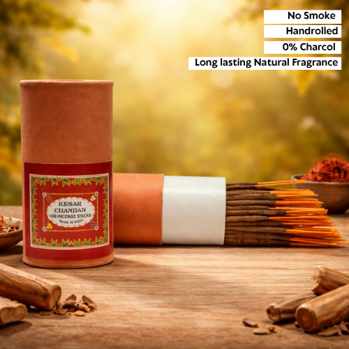 Kesar Chandan Agarbatti with rich saffron-sandalwood fragrance. No smoke, long-lasting, perfect for pooja and spiritual ambiance.