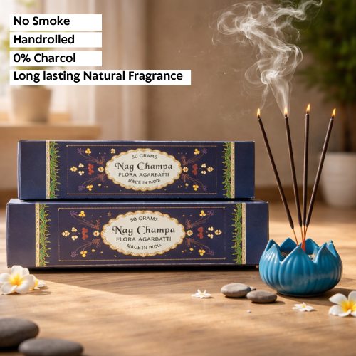 Nagchampa Flora Agarbatti with a classic calming fragrance. Low smoke and long-lasting, perfect for pooja and meditation.